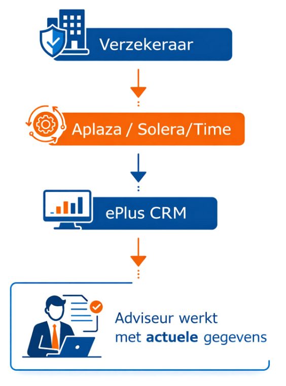 De integratie van Aplaza en Solera/TIME is in ePlus CRM namelijk volledig vereenvoudigd. In andere systemen moet u apart schakelen tussen Aplaza en Solera/TIME en moet u handmatig stappen doorlopen. Maar in ePlus CRM werkt alles logisch samen in één overzichtelijke omgeving. Dat maakt vooral processen zoals prolongatie een stuk makkelijker en sneller.